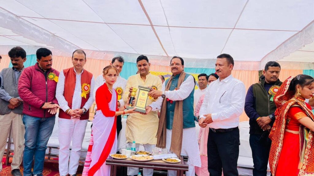 भीमताल के इंटर कॉलेज चांफी में रक्षा राज्य मंत्री विद्यार्थियों को सम्मानित करते हुए