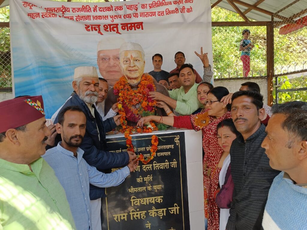 भीमताल (नैनीताल)। भीमताल के राजगुरु चौराहे पर कांग्रेसियों ने बुधवार को उत्तर प्रदेश और उत्तराखंड के पूर्व मुख्यमंत्री नारायण दत्त तिवारी की जंयती और पुण्यतिथि पर उन्हें श्रद्धांजलि देकर याद किया। कांग्रेसियों ने पूर्व सीएम की मूर्ति पर माल्यार्पण कर याद किया। कांग्रेसियों ने कहा कि एनडी तिवारी के कार्यकाल में जितना विकास कार्य हुआ उसकी झलक आज उत्तराखंड में देखने को मिलती है। कार्यक्रम में नगर अध्यक्ष डीके डालाकोटी, चेयरमैन देवेंद्र सिंह चनौतिया, युवा जिला उपाध्यक्ष नीरज कुमार, विधानसभा अध्यक्ष सूरज मेहरा, हेमा परगांई, गोपाल दत्त पलड़िया, खुशीराम, पवन जोशी, विजय नेगी, गुंजन रौतेला, प्रकाश हर्बोला, शुभम नैनवाल शामिल रहे। इधर धारी के पदमपुरी में विधायक राम सिंह कैड़ा की ओर से याद में बनाए गए पार्क में विधायक राम सिंह कैड़ा ने पूर्व सीएम एनडी तिवारी की मूर्ति पर माल्यार्पण कर उन्हें श्रद्धांजलि दी। विधायक ने संबोधित करते हुए कहा कि पूर्व सीएम देश की राजनीति में बहुत बड़ा कद थे। तिवारी ने उत्तर प्रदेश और उत्तराखंड के विकास के लिए अपना जीवन समर्पित कर दिया। उत्तराखंड में सिडकुल की स्थापना, पहाड़ों में स्वास्थ्य सुविधाएं पहुंचाना और मंडी की स्थापना के साथ सड़कों का जाल उनके द्वारा किया गया है। जिसे लोग आज भी याद करते हैं। पंडित नारायण तिवारी का देश की राजनीति में बहुत बड़ा कद रहा है। केंद्र में मंत्री हो या दोनों राज्यों में मुख्यमंत्री के रूप में तिवारी जी की सबसे महत्वपूर्ण भूमिका रही है, उत्तराखंड के अंदर सिडकुल की स्थापना,पहाड़ों पर स्वास्थ्य सुविधाएं पहुंचना, राज्य में मंडी की स्थापना,सड़को का निर्माण, ऐसे सभी कार्य उनके द्वारा किए गए,कार्यक्रम में मंडल अध्यक्ष प्रदीप बिष्ट, श्रवण कुमार, कंचन, नानू, प्रकाश आर्य, सरोज आर्य, पुष्कर महरा, कृपाल महरा, दुर्गा दत्त तिवारी, कमल जोशी,मोहन पाठक, आदि लोग मौजूद रहे।ग्राम सलडी में भी पर्वतपुत्र नारायण दत्त तिवारीकी पुण्यतिथि के अवसर पर देवी मंदिर सलडी में यज्ञ अनुष्ठान किया गया व श्रद्धांजलि अर्पित