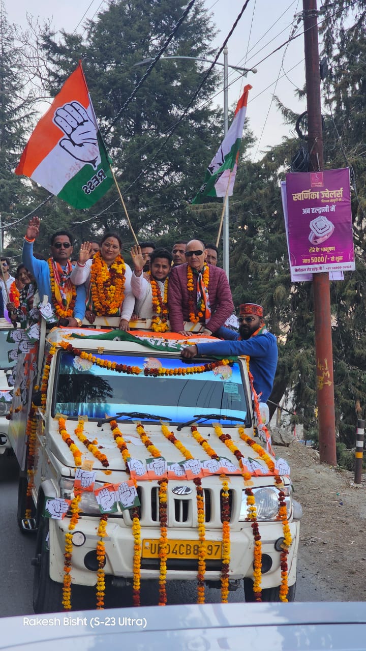 भीमताल । भीमताल से कांग्रेस की निर्वाचित पालिकाध्यक्ष सीमा टम्टा ने सोमवार को सभासदों के साथ नगर क्षेत्र में विजय जुलूस यात्रा निकाली। सीमा ने विजय यात्रा के माध्यम से लोगों को जीत दिलाने के लिए धन्यवाद किया। सीमा ने कहा कि भीमताल में पेयजल, सीवर की समस्या के साथ पार्किंग का निर्माण कार्य किया जाएगा। साथ ही प्राधिकरण को सरल बनाने का काम भी किया जाएगा। उन्होंने कहा कि सभी वार्डों में जनता दरबार लगाकर समस्याएं भी हल की जाएंगी। रैली में सभासद रामपाल सिंह गंगोला, विमला आर्या, दीपक कुमार, हेमा दुम्का, शुभम नैनवाल ने भी मतदाताओं का आभार जताया। इस दौरान डीके डालाकोटी, देवेंद्र सिंह चनौतिया, देवेंद्र फर्त्याल, विक्की जीना, राकेश बृजवासी, नीरज कुमार, विपिन सनवाल, गोपाल दत्त पलड़िया, सतीश वर्मा, सतीश टम्टा, भूपेंद्र कनौजिया मौजूद रहे।