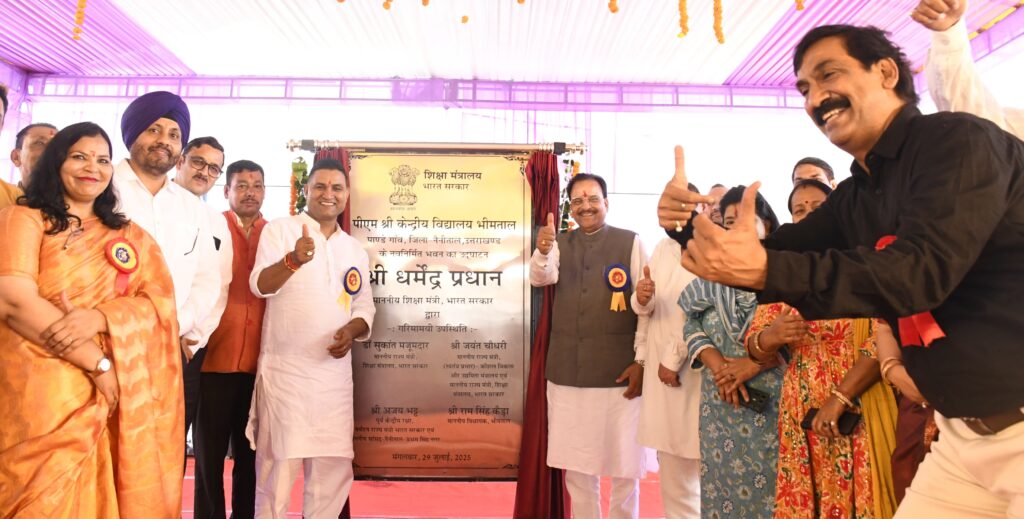 भीमताल : नैनीताल-उधम सिंह नगर सांसद अजय भट्ट ने मंगलवार को 25.84 करोड़ रुपये की लागत से बने नव निर्मित पीएम केंद्रीय विद्यालय भवन, भीमताल का विधिवत लोकार्पण किया। इस अवसर पर विद्यालय परिसर में एक भव्य सांस्कृतिक कार्यक्रम का आयोजन किया गया, जिसमें विद्यार्थियों ने वंदना, स्वागत गीत, छोलिया नृत्य तथा लोकसंस्कृति से ओत-प्रोत प्रस्तुति देकर अतिथियों का स्वागत किया। इस अवसर पर नई दिल्ली स्थित भारतीय मंडपम से केंद्रीय शिक्षा मंत्री धर्मेंद्र प्रधान द्वारा वर्चुअल माध्यम से देशभर के नव निर्मित केंद्रीय विद्यालय भवनों का लोकार्पण किया गया और इसे राष्ट्र को समर्पित किया गया। कार्यक्रम के दौरान मंत्री ने सभी राज्यों में आयोजित समारोहों को संबोधित भी किया।