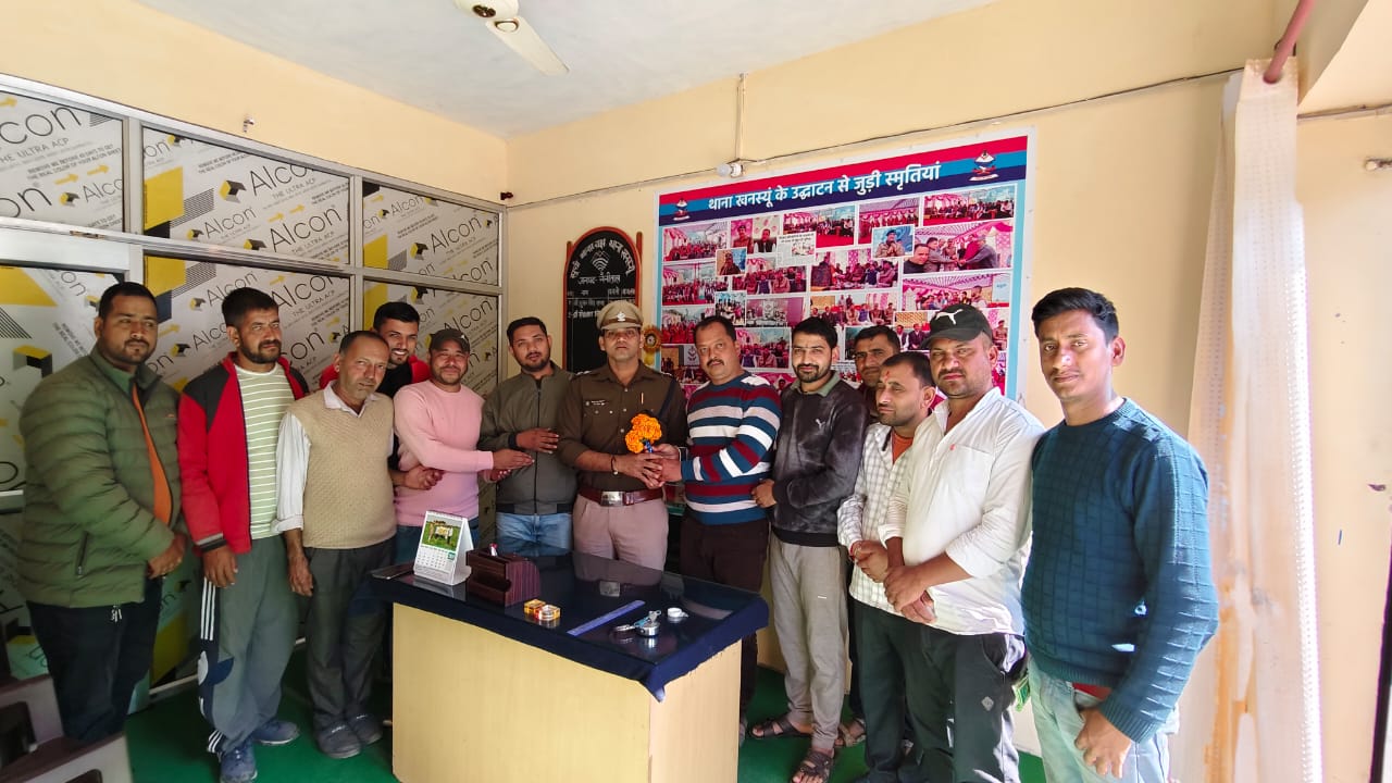 भीमताल। ओखलकांडा के खनस्यूं थाने के नवनियुक्त थानाध्यक्ष विजय पाल ने शुक्रवार को कार्यभार संभाला। व्यापार मंडल की तरफ से थानाध्यक्ष का स्वागत किया गया। थानाध्यक्ष ने लोगों को भरोसा दिलाया कि पुलिस लोगों की सुरक्षा के लिए कार्य करेगी। साथ ही नशे पर अंकुश लगाया जाएगा। उन्होंने कहा कि ओखलकांडा में उन्माद फैलाने वालों के खिलाफ कार्रवाई की जाएगी। इस दौरान व्यापार मंडल अध्यक्ष राजेंद्र बर्गलीष महामंत्री संजय सिंह ऐरी भाजपा किसान मोर्चा अध्यक्ष दीपक बर्गली, रामू मचखोलिया, पंकज सुयाल, दीपक मेहता, चंदन, प्रकाश, रवि आदि मौजूद रहे।
